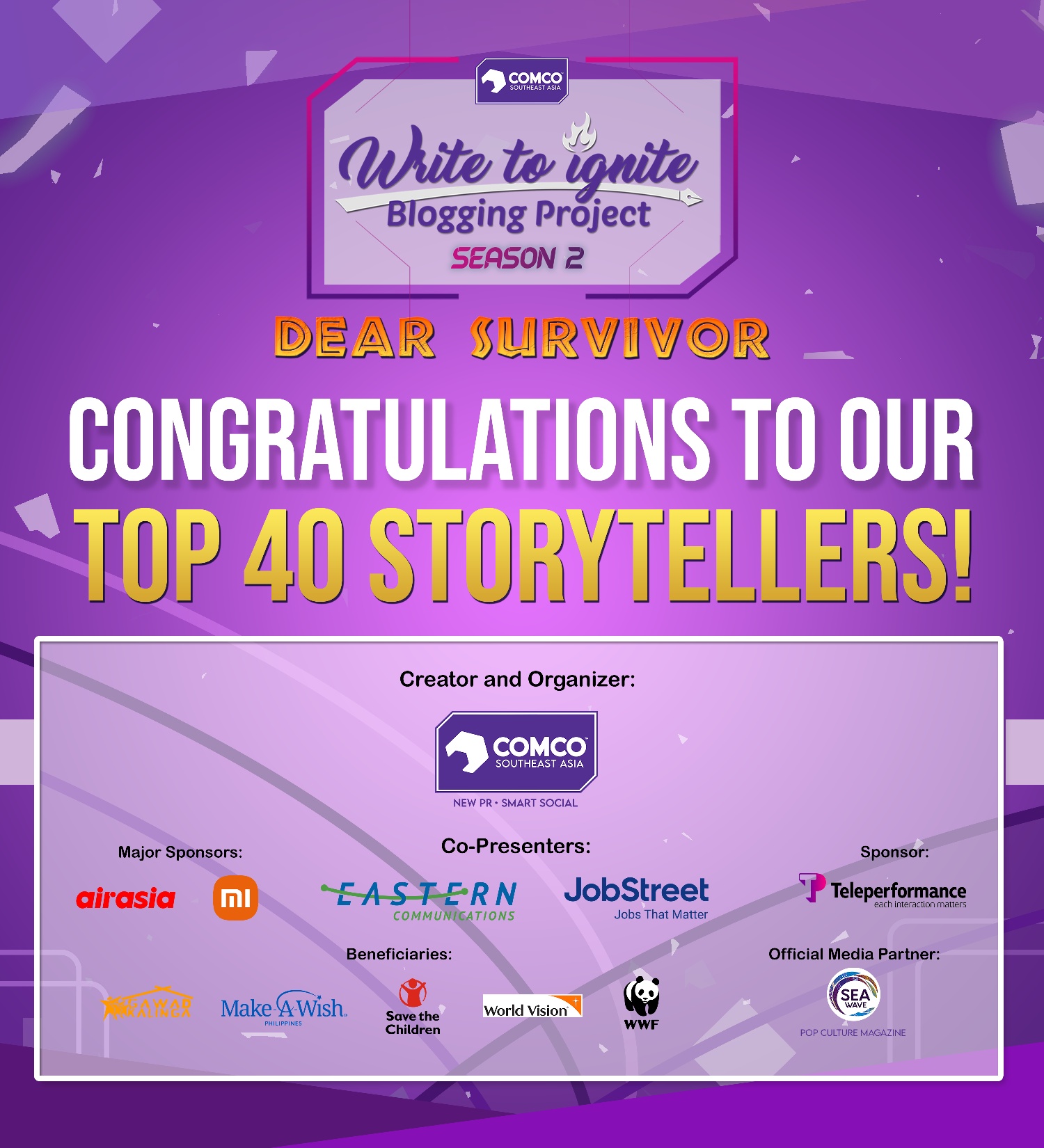 Write to Ignite Blogging Project Season 2: Dear Survivor is made possible by ComCo Southeast Asia, with Eastern Communications and Jobstreet as co-presenters, with AirAsia and Xiaomi Philippines as major sponsors, and with Teleperformance as sponsor. SEA Wave pop culture magazine is the official media partner.