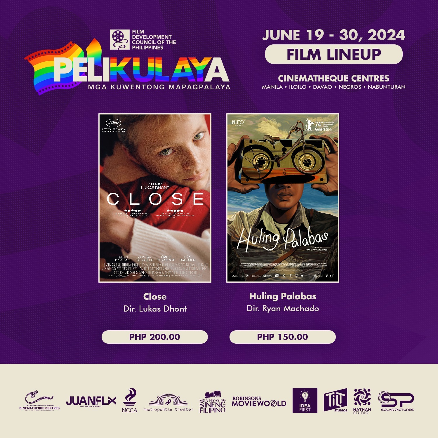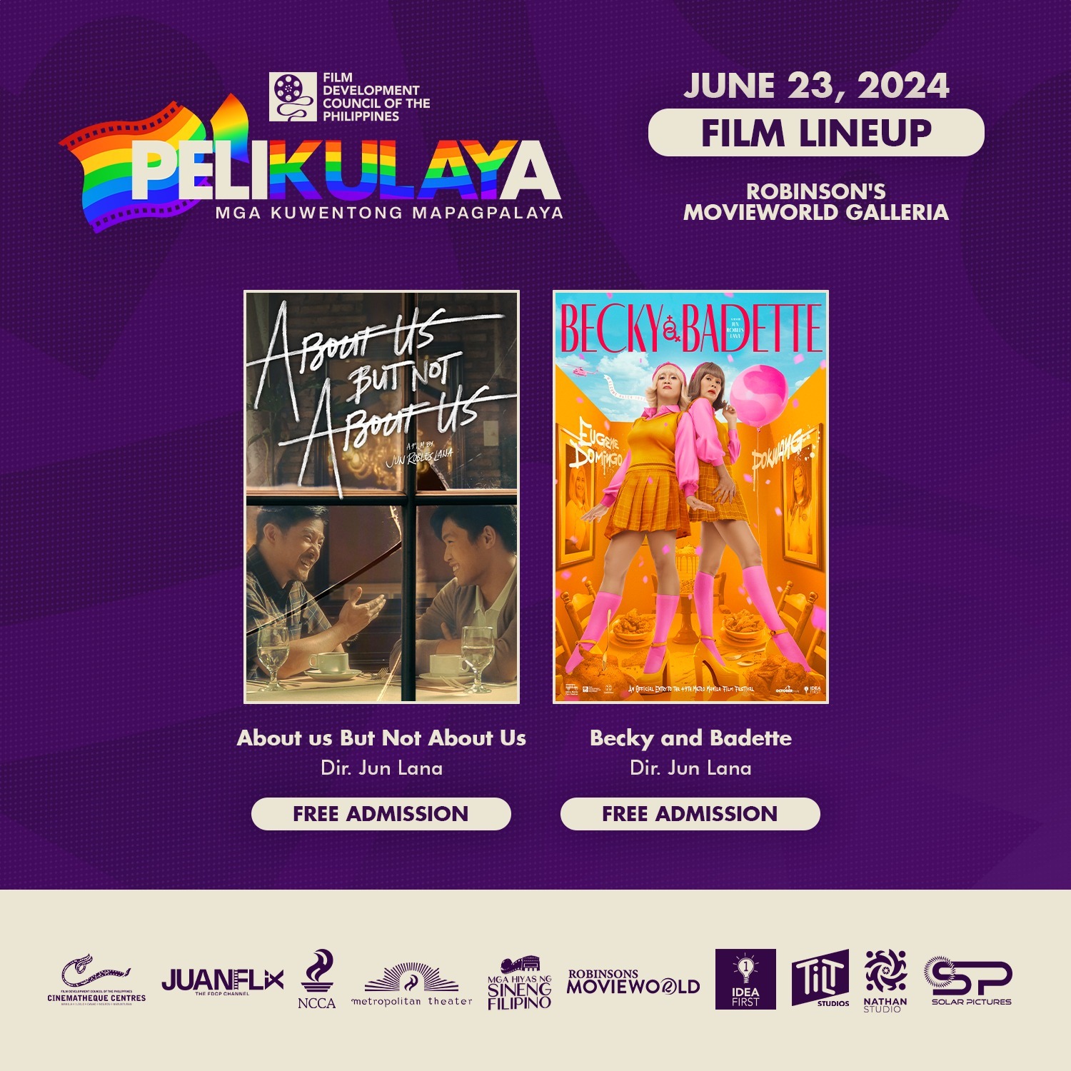The event highlights movies and short films that tell stories of self-discovery, resilience, discrimination, struggles and triumphs of queer characters. Some films included in the lineup are Facifica Falayfay (1969) by Luciano Carlos, Huling Palabas (2023) by Ryan Machado, Ang Sayaw ng Dalawang Kaliwang Paa (2011) by Alvin Yapan, Kasal (2014) by Jay Altarejos, Divine Factory (2022) by Joseph Mangat, Ang Tatay Kong Nanay (1978) by Lino Brocka, Oliver (1983) by Nick Deocampo, Close (2022) by Lukas Dhont, Kaming Mga Talyada (1962) by Tony Cayado, Monster (2023) by Kore-eda, Gameboys: The Movie (2021) by Ivan Payawal, and Becky and Badette (2023) and About Us But Not About Us (2023) by Jun Lana.