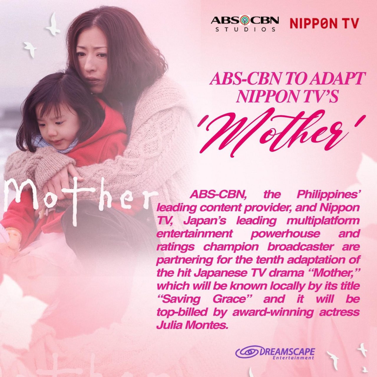 ABS-CBN, the Philippines’ leading content provider, and Nippon TV, Japan’s leading multiplatform entertainment powerhouse and ratings champion broadcaster, are partnering for the tenth adaptation of the hit Japanese TV drama “Mother” for Filipino audiences, which will be known locally by its title “Saving Grace” and it will be top-billed by award-winning actress Julia Montes.