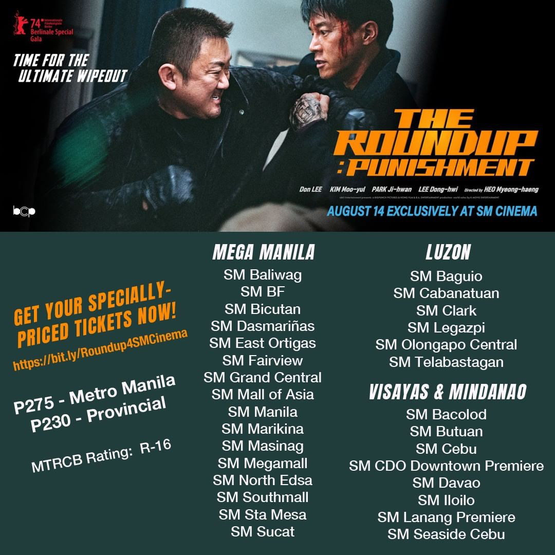 Distributed by Black Cap Pictures, “The Roundup: Punishment” is now showing exclusively at SM Cinemas (https://www.smcinema.com/Browsing/Movies/Details/h-HO00000813) with specially priced tickets – Php 275 in Metro Manila and Php 230 in provinces.