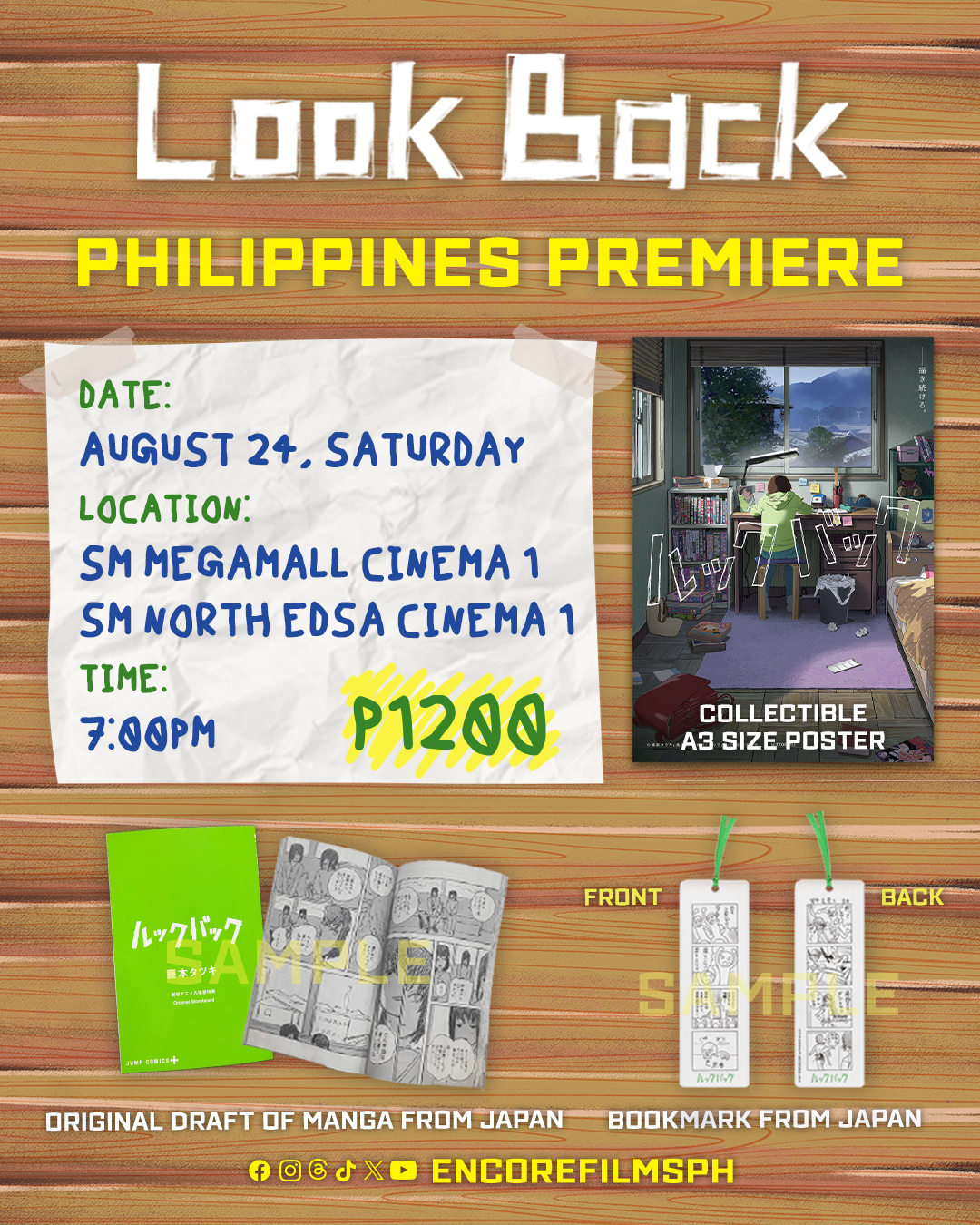 Look Back opens in Philippine cinemas on August 28. Follow Encore Films PH (https://www.facebook.com/encorefilmsph/) on Facebook and @encorefilmsph (https://www.instagram.com/encorefilmsph/) on Instagram for the latest updates.