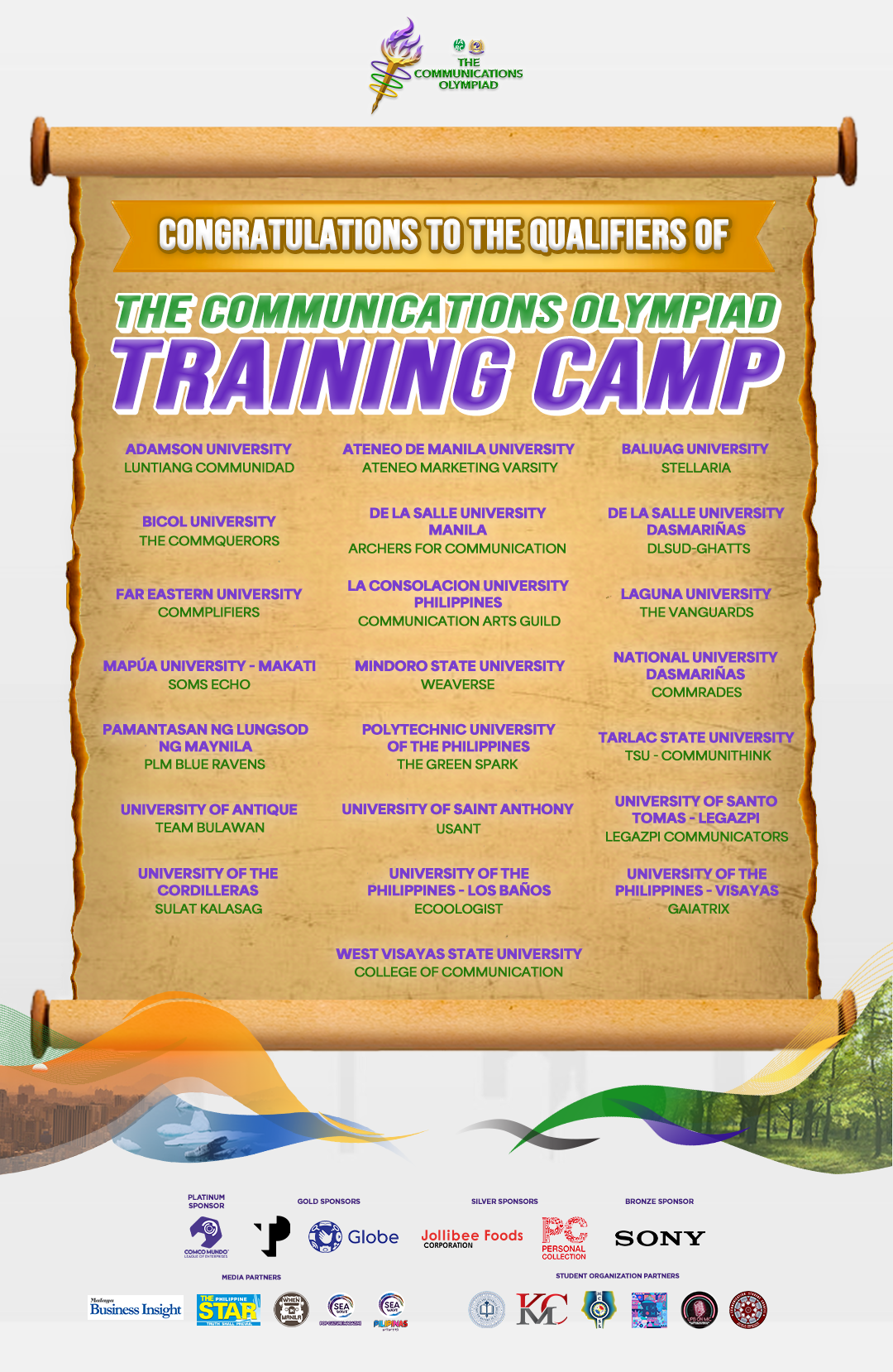 The Communications Olympiad is organized by IABC Philippines and the COMCO School of Communications, and sponsored by COMCO Mundo League of Enterprises, Globe Telecom Inc., Teleperformance Philippines, Jollibee Foods Corp., Personal Collection Direct Selling Inc., and Sony Philippines. Its official media partners include Malaya Business Insight, SEA Wave Pilipinas, SEAWaveMag.com, The Philippine STAR, and WhenInManila.com. The official student organization partners are the Arts and Sciences Society of English Majors from West Visayas State University, Kapunungan sa mga Mass Communicators – Silliman University, PLM Mass Communication Students’ League from Pamantasan ng Lungsod ng Maynila, Team Communication from De La Salle University, University of the Philippines – Baguio On MIC, and the West Visayas State University Communication Student Council.
