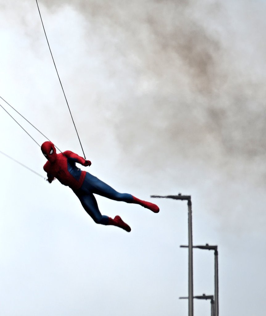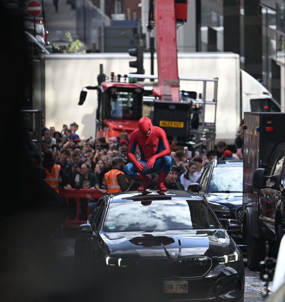 Shortly after the teasers, we got our first real look at Spider-Man in action. It’s a well-known fact that recent Spider-Man films used CGI to recreate scenes because of the pandemic. Now that production is back in full swing, we are back to old school stunts. Fans in Glasgow were treated to an open-set shoot featuring Spider-Man swinging across the city, buildings go up in flames, and cars speed through the streets.