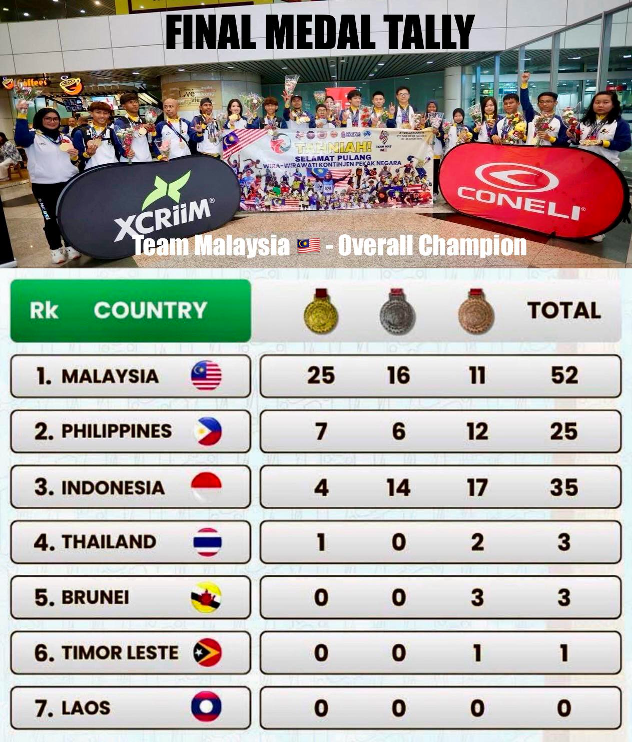 After an intense six-day competition, the results are in, with Malaysia winning an overwhelming victory by racking up 25 gold medals, 16 silver medals, and 11 bronze medals. The Philippines ranked 2nd with a total of 25 medals (7 gold, 6 silver, 12 bronze), followed by Indonesia in 3rd place with 35 medals (4 gold, 14 silver, 17 bronze).