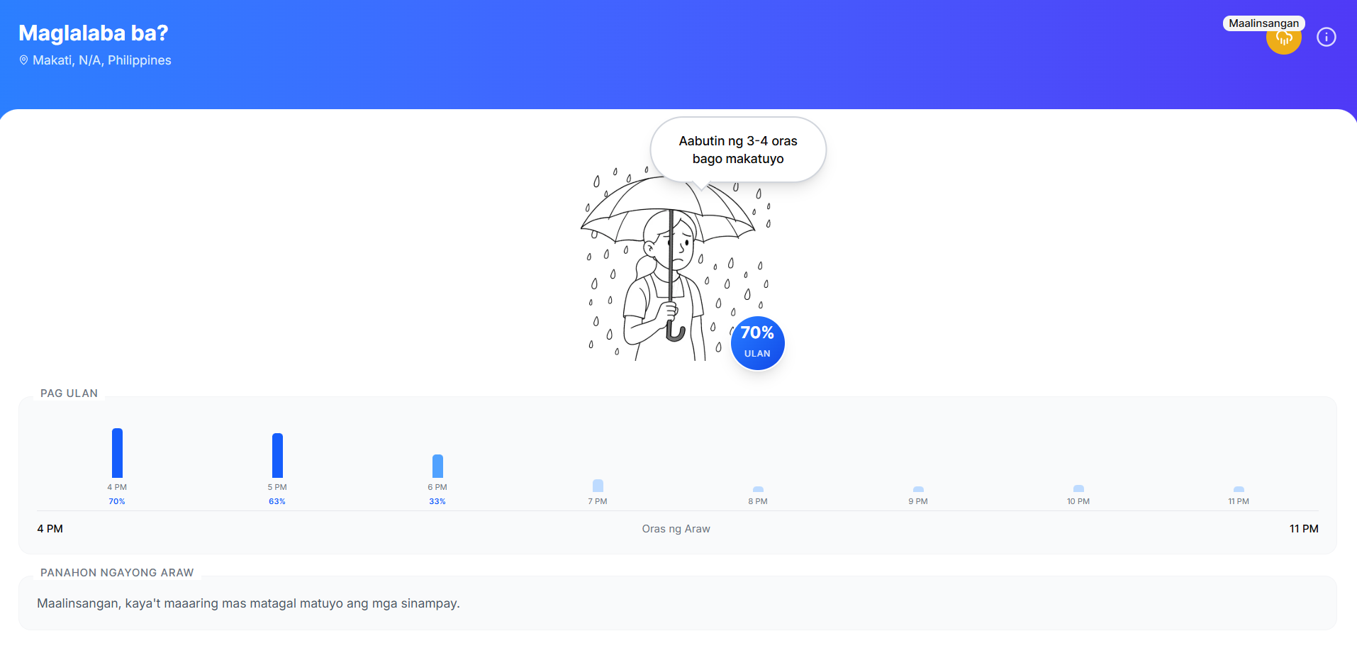 Fed with real-time weather information from Open-Meteo, the support of OpenWeatherMap, and the geo-location of the user, Maglalaba Ba combines different datapoints to provide a simple answer on what should be the optimal time to start doing the laundry.
